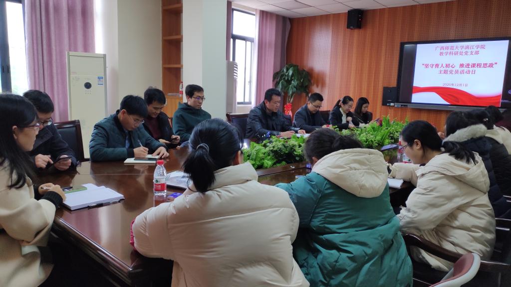 12月1日,在教科处党支部“坚守育人初心 推进课程思政”主题党员活动日上,支部书记杨杰夫为全体支部党员着重解读了《全面推进广西高等学校课程思政建设的实施意见》、《高等学校课程思政建设指导纲要》、《广西师范大学漓江学院全面推进课程思政建设实施方案》等三份文件的要点和意义。他指出教学科研处全体党员要带头学习、认真贯彻落实,紧紧抓住教师队伍“主力军”、课程建设“主战场”、课堂教学“主渠道”,让所有教师、所有课程都承担好育人责任,使各类课程与思政课程同向同行,将显性教育和隐性教育相统一,形成协同效应,构建全员全程全方位育人大格局。必须持之以恒抓好课程思政建设。一要强化课程建设管理,优化课程思政内容供给,科学设计课程体系,分类推进课程思政,构建科学合理的课程思政教学体系。二是要提升课堂教学质量,切实把思政元素融入到专业教学与育人实践中,把课程思政融入课堂教学全过程,创新课堂教学模式,不断拓展课程思政建设方法和途径。三是要加强师资队伍建设,着力提升教师课程思政建设的意识能力。四是要注重考核督导,建立健全课程思政建设质量评价体系和激励机制。要求,同志们要切实强化主体责任,作好宣传引导工作,全力保障各学院程思政建设取得实效,不断开创课程思政工作的良好局面。