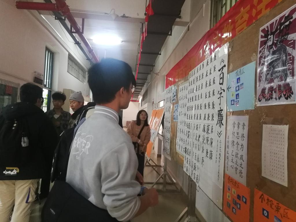 值第十七个国际反腐败日之际,为营造高校风清气正的良好氛围,理工学院特开展“漓院清风,廉动校园”主题廉洁教育活动。12月10日上午,各团支部的廉洁作品在学院走廊展出,由每位党总支委员、辅导员及各团支部代表对作品进行投票,其中书法作品颇受老师及同学们的亲睐。