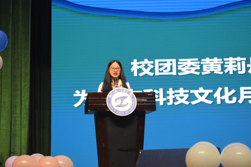 黄莉丹老师代表校团委致辞,她指出,一年一度的理工科技文化月是理工学院最有影响、参与同学最多的学生活动之一,是广大青年学生素质拓展的有效载体。本届科技文化活动月以“众心向党,逐梦起航”为主题,充分展示理工学院校园文化建设的成果和大学生开拓进取、奋发向上的精神风貌,进一步促进校风、学风建设,推动青年学生的知识、素质、能力三方面协调健康发展。