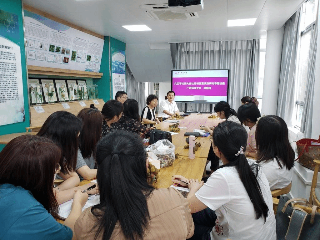首先,沙龙第一环节内容为社情民意调查研究,邀请了九三学社广西师范大学支社主委陈振锋教授进行了研究相关说明,他鼓励语言文学学院青年教师关心社会、为国家的发展献言献策。