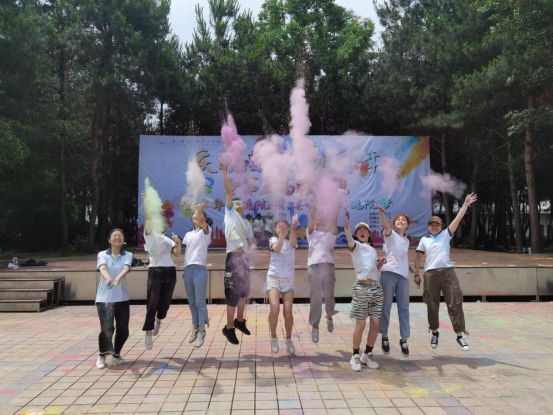 本次活动设置的叠叠乐、精准投篮、袋鼠跳接力、穿针引线等一系列小游戏,同学们在完成任务的同时,也提高了团结协作的能力,增加了彩虹跑活动的趣味性。随后,抛洒彩虹粉环节开始,现场气氛被引向最高点,广场上人头攒动,同学们伴着音乐互相抛洒彩色粉末,相互追逐、尽力狂奔,欢声笑语弥漫校园,衣服染上了一抹抹亮丽的彩虹,成为校园内的一道绝美的风景线。