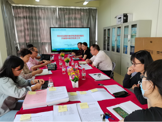 5月25日下午,语言文学学院院长何玲、教育与音乐学院院长彭超、教学科研处副处长李明阳、教学科研处钟英老师一行到马克思主义学院进行期中教学检查,院长张常永、副院长吴秋燕、各教研室主任及教学秘书全程参与。