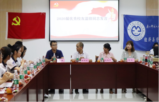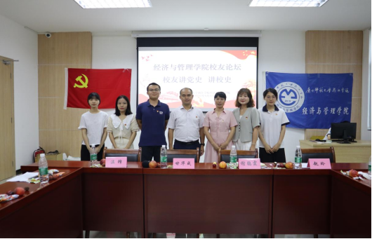 6月23日下午,经济与管理学院在图书馆C馆三楼报告厅开展校友讲党史、讲校史主题活动,经济与管理学院党总支书记甘华成、辅导员谢鹃霞、赵玲、2020届优秀校友温锋及2017级学生党员出席本次活动。