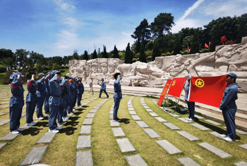 10日上午,团队乘车来到全州县红军湘江战役纪念园,首先于凭吊广场进行体验式教学。凭吊广场的巨大石墙上雕刻着红军渡湘江的艰苦与惨烈,让成员们纷纷肃穆致礼,重温入团誓词。