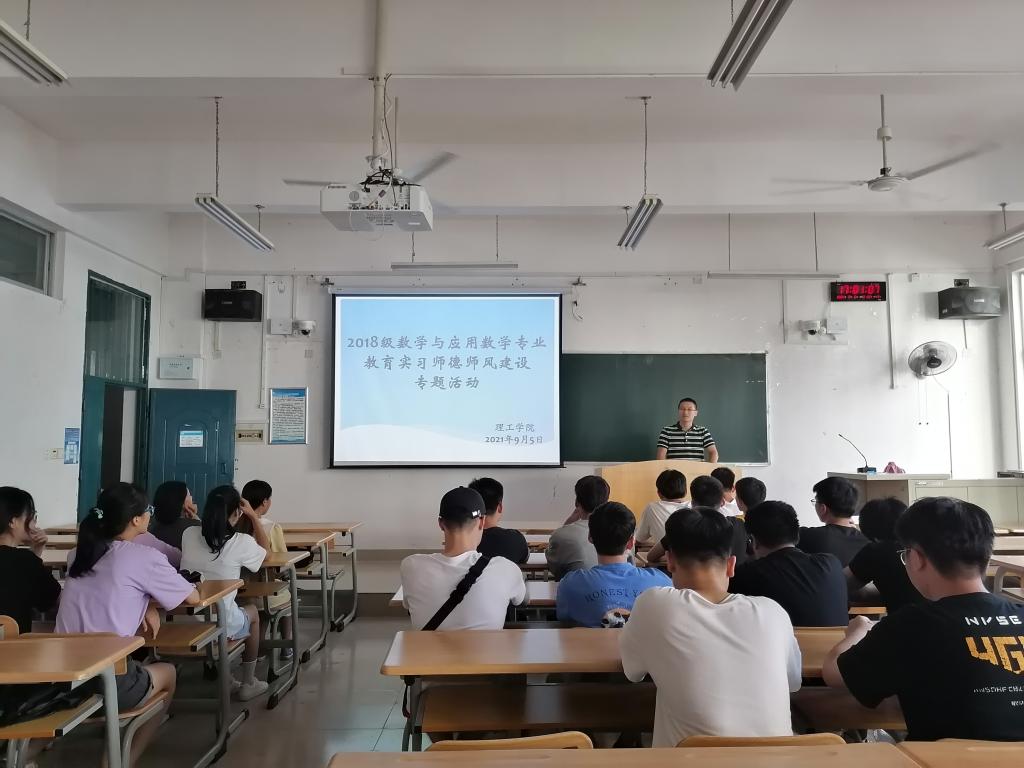 9月5日,理工学院在至善楼1210教室针对即将定点实习的28位2018级数学与应用数学专业学生进行师德师风教育,应用数学教研室主任李勇刚,实习指导教师陈家宁参加本次活动。