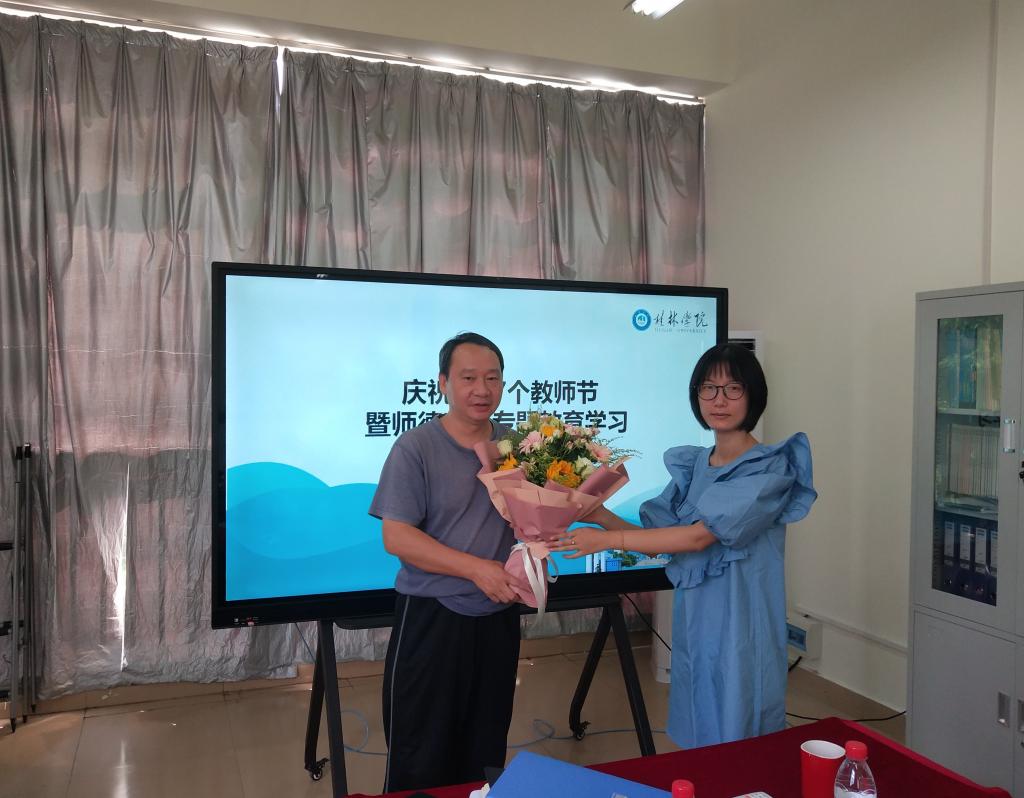 在活动开始,张常永院长向全体教师表示节日的问候和祝福,并由青年教师李延和刘莹分别向老教师代表曾云莺副教授、李会平副教授送上节日祝福。随后,副院长、党支部书记吴秋燕以“赓续百年初心,担当育人使命”为主题带领全体教职工回顾了党的十八大以来习近平总书记关于教育工作的重要论述,鼓励全院教师以习近平新时代中国特色社会主义思想为指引,砥砺前行,再接再厉,以先进典型为榜样,要进一步加强教师队伍建设,自觉在为党育人、为国育才新征程中实现新作为、再创新辉煌。