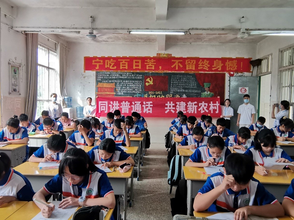 为庆祝中国共产党成立100周年,抓住青少年时期的语言学习关键期,着力加强青少年普通话教育,提高青少年的普通话水平和语言文化艺术的素养,帮助青少年成长成才。时值第24届全国推广普通话宣传周,9月16日上午,学校语言文字工作委员会前往阳朔县葡萄镇初级中学开展“推普助力乡村振兴”暑期社会实践志愿服务活动。语言文学学院副院长、校语委常务副主任陈锴老师,校语委指导老师邓克鹏、何一亿以及校语委学生干部参加本次活动。