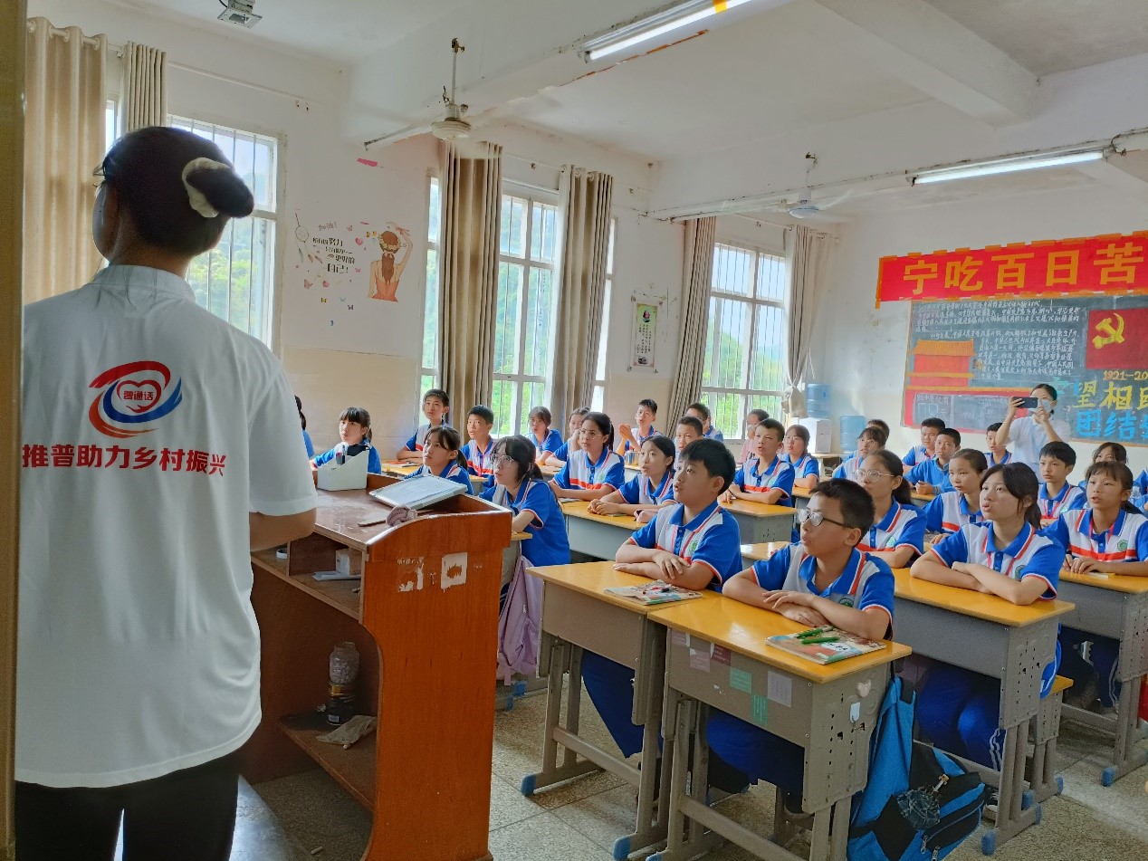 推广国家通用语言文字和推广普通话方面。通过发放“推普助力乡村振兴”调查问卷、学习了解普通话定义及其重要性、开展趣味语言文字游戏,让青少年在推普课堂中走近语言文字,在欢乐声中体会语言乐趣,充分认识到“讲好普通话,写好规范字”的意义。
