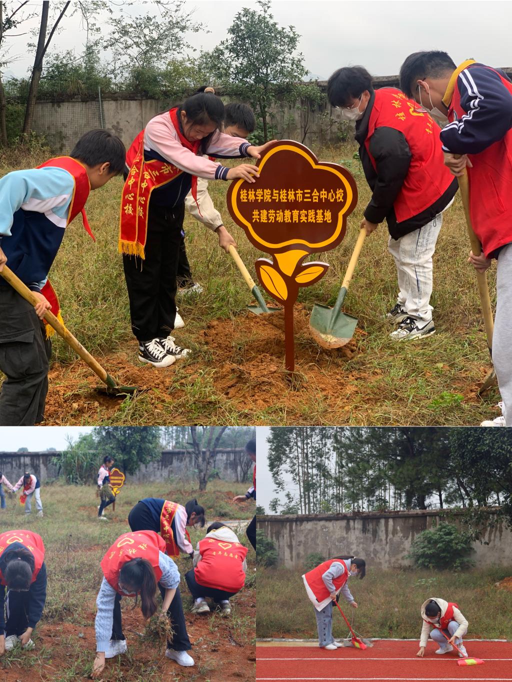 随后,桂林市三合中心校学生代表向我校教师代表佩戴红领巾。最后,由桂林市三合中心校校长莫运珍和我校学生事务部副部长/校团委书记王瑞共同为该劳动教育实践基地揭牌。揭牌仪式结束后,我校青年志愿者代表及桂林市三合中心校学生代表在阳智老师的带领下,一同来到劳动实践基地,开展除草、清扫田径场等劳动活动。