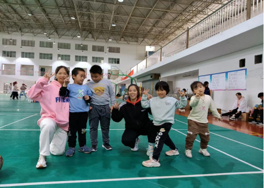 图:我校女子篮球队成员与兴趣班小朋友合影