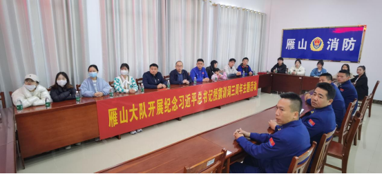 活动中,大家首先观看了消防救援宣传片以及雁山区消防救援大队消防干部、消防员分别就学习贯彻习近平总书记授旗训词精神心得体会进行了分享,并就消防救援队伍改革转隶、应急救援突发事件、日常训练管理、家庭生活等方面与大家进行了充分交流,现场气氛活跃。