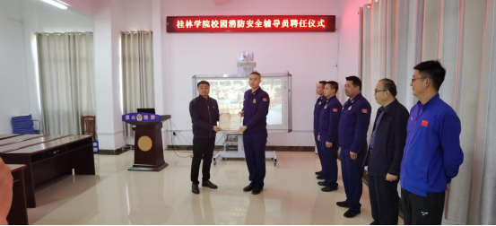 随后,双方举行了桂林学院校园消防安全辅导员聘任仪式。桂林学院李久华、周杰、付健及教师代表依次为雁山区消防救援大队唐雨翔、刘章颖、韩攀攀、唐浩颁发桂林学院校园消防安全辅导员聘书。