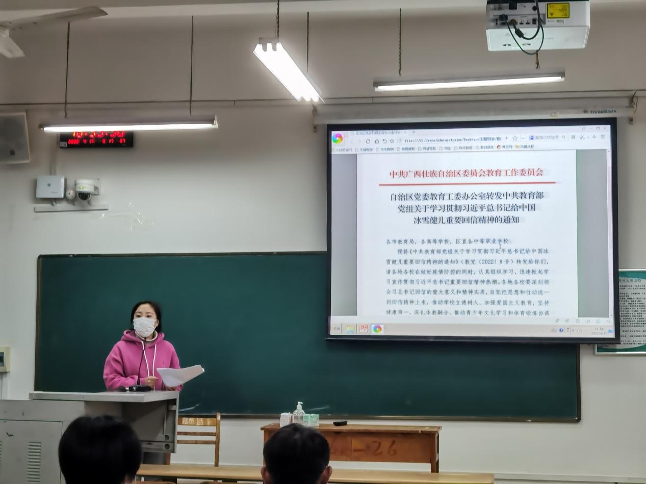 此次班会围绕着习近平总书记给中国单板滑雪运动员苏翊鸣的回信展开。本届冬奥会上,中国体育代表团取得我国参加冬奥会的历史最好成绩,为祖国和人民赢得了荣誉。正如习近平总书记所说:“新时代是追梦者的时代,也是广大青少年成就梦想的时代。希望你们心系祖国,志存高远,脚踏实地,在奋斗中创造精彩人生,为祖国和人民贡献青春和力量。”这既是对冰雪运动员的希望,也是对青年一代的寄语。同学们看完回信后热血澎湃,各抒己见。我们作为新时代的青年,要牢记习近平总书记的嘱托,不负青春、不负使命、不负出生在这个伟大的国家,成长在这个最好的时代,以中国冰雪健儿为榜样,奋勇拼搏和超越自我,唱响为国争光的青春赞歌。