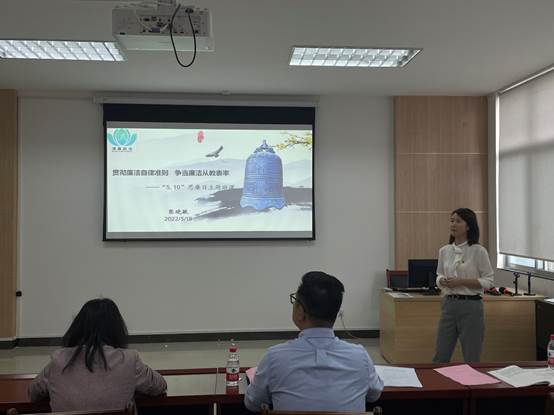 随后,由教工支部宣传委员张晓敏讲廉洁教育主题班课。张晓敏以《贯彻廉洁自律准则 争当廉洁从教表率》为题,围绕《中国共产党廉洁自律准则》和教师应如何做到廉洁从教两方面进行讲解,重点介绍了《中国共产党廉洁自律准则》的地位,并对《准则》内容进行了逐条解读,从保持廉洁自律,坚守高尚情操;抵制不良风气,保持教育公正;严谨治学,树立正确的学术道德观和学术价值观三个方面与党员教师进行探讨交流。