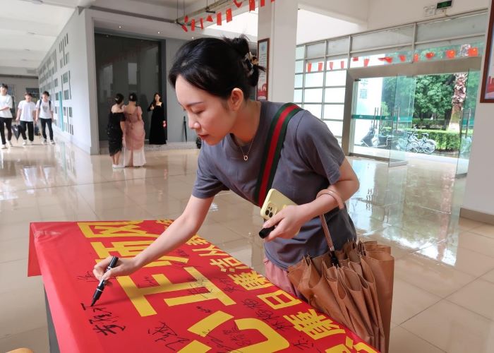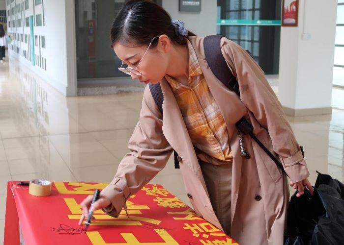 活动开始,陆续有老师来参加活动。负责引导的志愿者,为老师讲解本次活动的意义。老师们了解到,本次签字活动是加强校园清廉文化建设,营造廉洁的文化氛围,促进廉洁与专业建设相融相促,强化廉洁的文化的实践活动。党总支书记周杰带领的教师团队依次上前郑重在横幅上签下自己的名字。此外,在活动期间,也有众多学子好奇上前,引导者也耐心为其讲解。