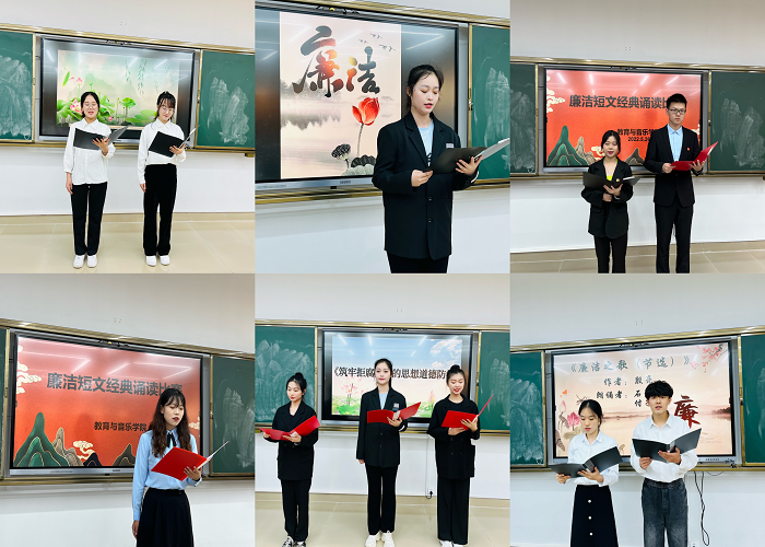 2022年是党的二十大召开之年,是新时代新征程中具有特殊重要意义的一年,为了加强校园清廉文化建设,营造廉洁文化氛围,教育与音乐学院于5月26日下午,在6242教室成功举办“廉洁短文经典诵读”比赛。此次比赛由教育与音乐学院辅导员王越、王雅和黄思朗老师担任评委。
