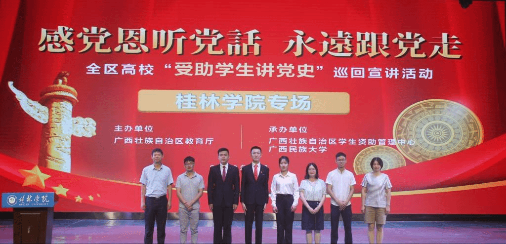 为深入学习贯彻习近平总书记在庆祝中国共产党成立100周年大会上的重要讲话精神和党的十九届六中全会精神,进一步创新资助育人方式,深入推进受助学生党史学习教育不断走深走实,6月24日上午,全区高校“受助学生讲党史”巡回宣讲活动(桂林学院专场)在我校弘善讲堂举行。宣讲团带队老师广西民族大学邱银强、李成志,我校学生事务部相关人员、各二级学院师生代表近300人参加活动。