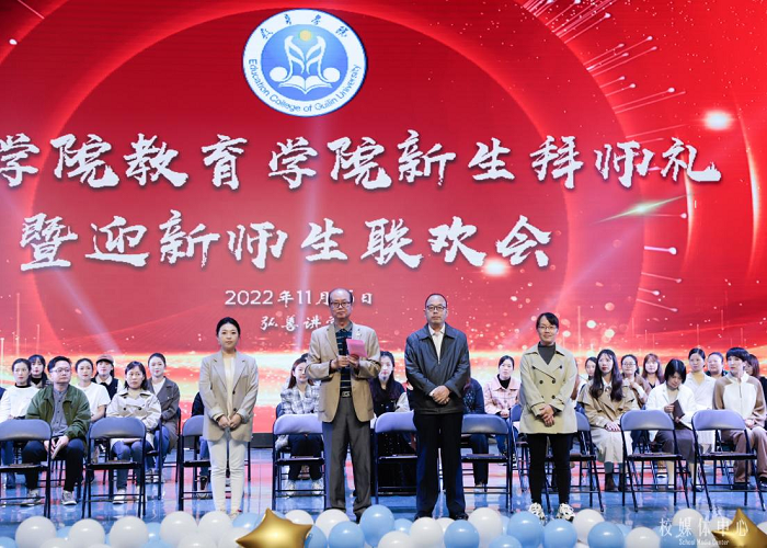 为弘扬中华民族传统文化,传承育人精神,11月16日下午,教育学院在弘善讲堂举行了2022级新生拜师仪式。学院院长彭超,党总支书记周杰,副院长江帆、黄小玲,学院全体老师以及2022级全体新生参加了此次仪式,仪式由学院党总支副书记熊云云主持。