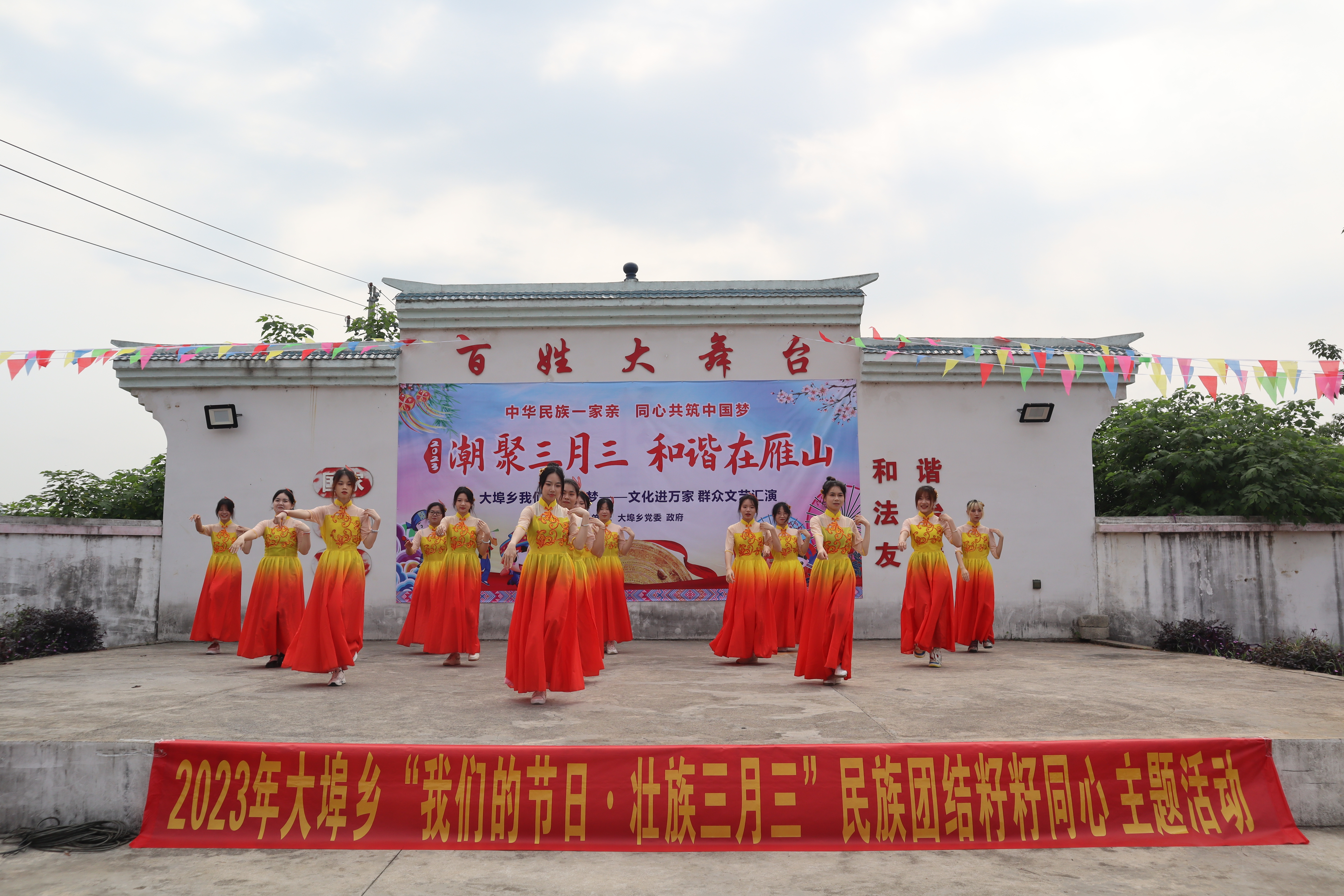 文艺汇演以大埠乡文艺文化志愿服务队的舞蹈《吉祥颂》拉开了序幕。城市设计学院14名学生组成的演出队伍为社区居民带来民族舞蹈《山歌好比春江水》,扎实的舞蹈功底、契合主题的服装与选材、配合默契的团队表演,有力地烘托了三月三民族文化主题,舞出了各民族努力奋斗建设共同体的和谐韵律,同学们的表现获得了现场观众的一致好评。