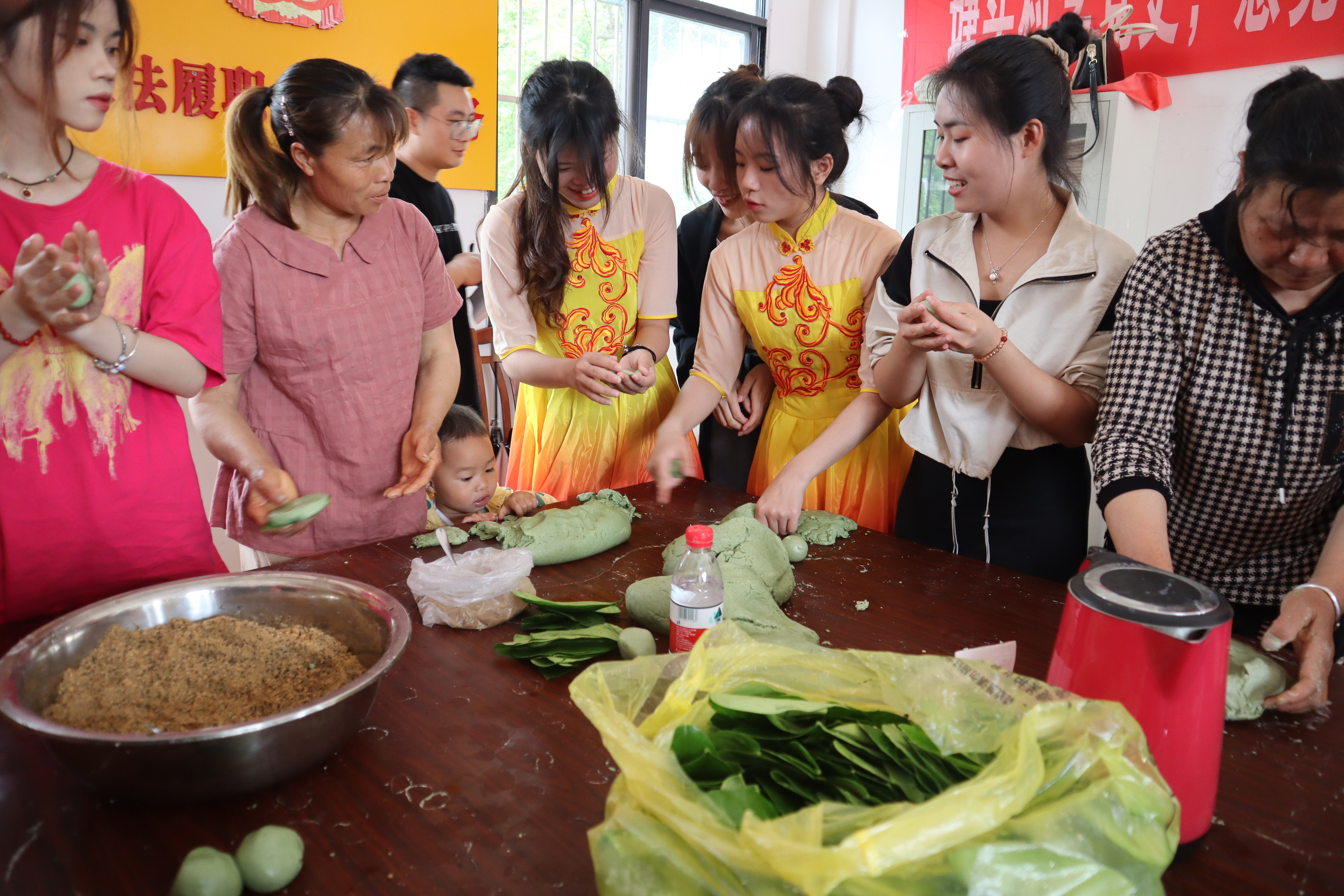 4月20日上午,城市设计学院师生前往大埠乡塘头村参与“潮聚三月三、和谐在雁山——文化进万家群众文艺汇演"并开展三月三艾叶粑粑制作体验活动。城市设计学院团总支书记刘永涛,学生党支部书记邱胜昇、副书记易彦兵及团总支学生会成员参加了本次活动。
