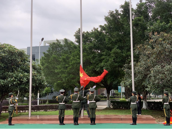 国旗护卫队的同学们铿锵的步伐敲碎晨曦的寂静,金色的霞光深度赫赤国旗,当国歌响起,全体师生肃立注目,五星红旗冉冉升起,自豪与骄傲之情油然而生。