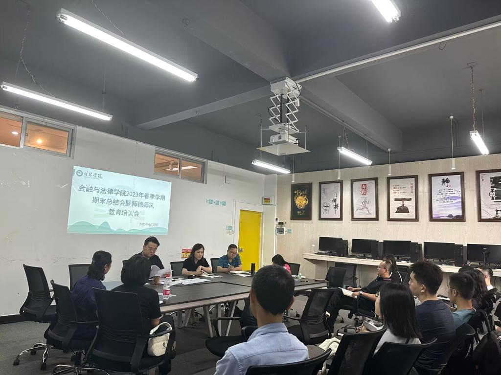 6月29日下午,金融与法律学院在3207教室召开2023年春季学期期末总结会暨师德师风教育培训会。会议由学院党总支书记陈俊杰主持,学院全体教师出席了此次会议。