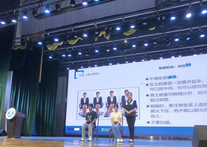 接着,冯凯琦老师邀请同学上台示范,向同学们展示如何使自身的体态更加美观,“站如松,坐如钟”。站时抬头挺胸可以显现出自信,坐时腰背挺直可以显得端庄大方,凸显出自身的气质。观众席的同学们也根据冯老师的示范,调整自身的坐姿。