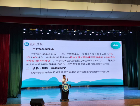 会上,朱熠轩从高校资助政策内容、资助政策重要性、生源地信用助学贷款政策和桂林学院学生资助政策四个部分依次进行讲解。他通过图文分享,详细介绍了“奖、助、贷、勤、补、减、偿、免”八位一体的资助政策体系,并通过个人经历分享、与新生互动等形式,进一步增进了新生对我国资助政策的认识。他重点强调了国家秉承“不让一个学生因家庭经济困难而失学”的初心、各项国家资助政策的申请条件,同时劝诫新生要努力学习,利用党和政府提供的便利之风,更好地提升自我,用优异的学习成绩回馈党和政府、回馈学校。