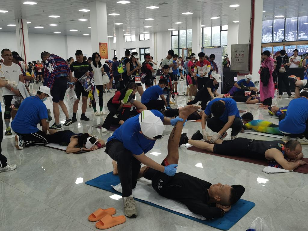 图:志愿者帮助运动员拉伸放松