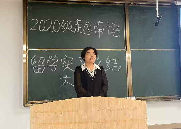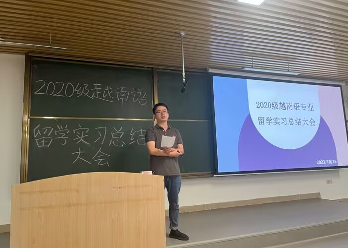10月26日下午,人文学院在1214教室举行2020级越南语专业留学实习总结大会。副校长、人文学院院长何玲出席大会并讲话。发展与质量评估处副处长赵莉莉,人文学院党总支书记庞一飞、副院长陈锴、副书记韦微及越南语专业全体教师、2023级、2020级越南语专业全体学生参加会议。