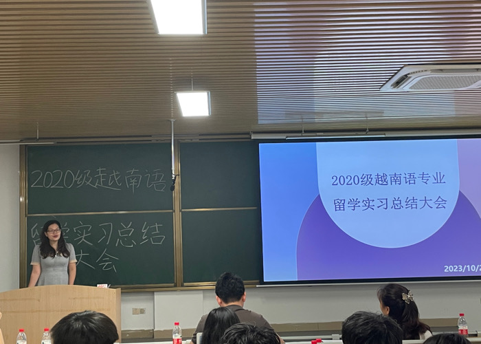 会上,2020级越南语专业学生分别就在越南期间的留学学习情况、留学生活情况、实习实践情况以及留学实习的感想等作了全面的分享汇报。在汇报过程中同学们多次表达了对学院以及学校的感谢,让大家能走出国门,体验语言对象国的风土人情,学习地道的越南语。