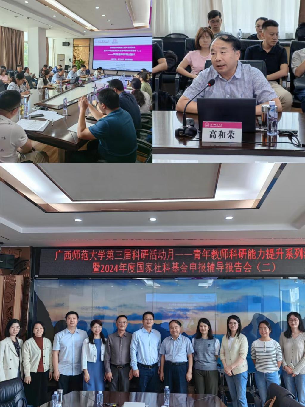 为落实广西师范大学对口支援我校的重点工作事项,11月5日上午,学校组织相关学科的青年教师,首次参加在广西文科中心多功能学术会议厅举行的广西师范大学青年教师科研能力提升系列沙龙暨2024年度国家社科基金申报辅导会。会议由厦门大学党委常委、宣传部/教师工作部部长高和荣教授主讲。
