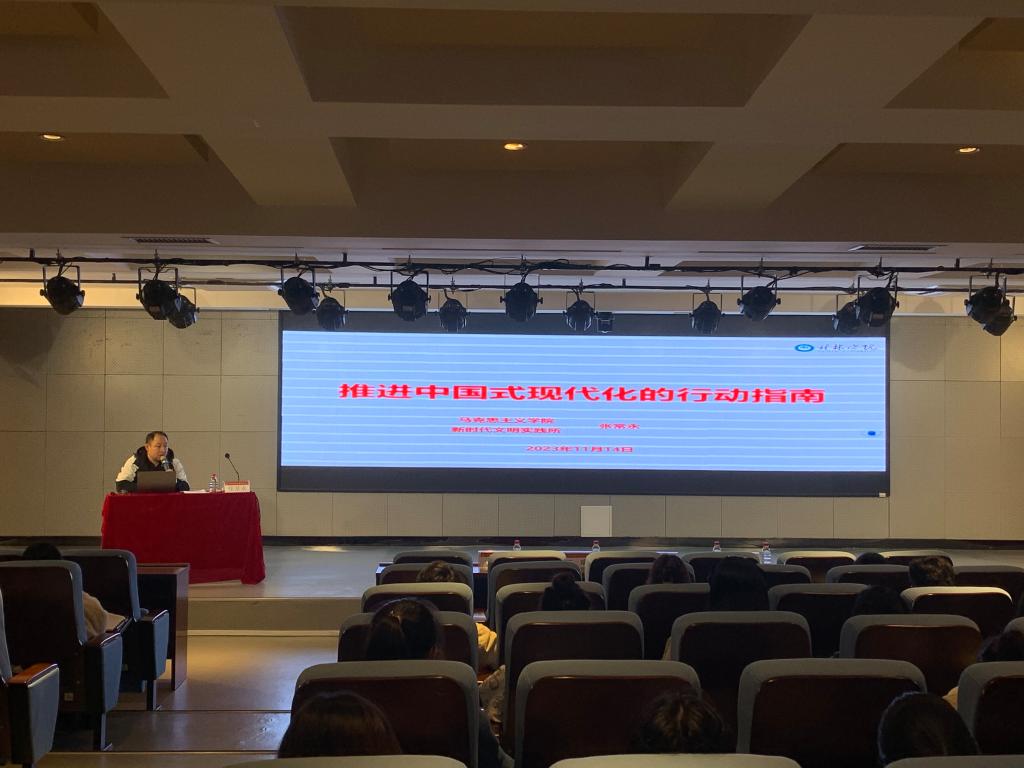 张常永老师以“推进中国式现代化的行动指南”的为题,分别从“中国式现代化是我们党领导人民长期探索和实践的重大成果”“中国式现代化是中国共产党领导的社会主义现代化”“中国式现代化是强国建设、民族复兴的康庄大道”等六个方向进行讲解。张老师讲解到中国式现代化是具有一般现代化特征且具有中国特色的现代化,事实和实践证明,历史和人民选择了中国共产党,不论任何局面和困难,党都能把握历史主动,今天的成就是一代代共产党人接续奋斗的结果。他鼓励“青马班”学员们要做坚定的马克思主义者,将青春融入党和人民的事业中去,以恒心、耐心、决心在青春赛道上奋力奔跑,朝着光辉灿烂的伟大目标砥砺奋进。