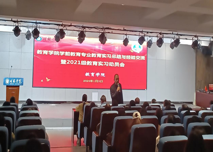 为了交流实习体会,总结实习经验,助力学生专业成长,1月3日下午,教育学院在至善讲堂举行了前教育专业教育实习总结与经验交流暨2021级教育实习动员会。彭超院长、周杰书记、黄小玲副院长、宋丹阳副书记、学前教育教研室全体教师、学前教育专业2020级实习生及2021级全体学生参加。