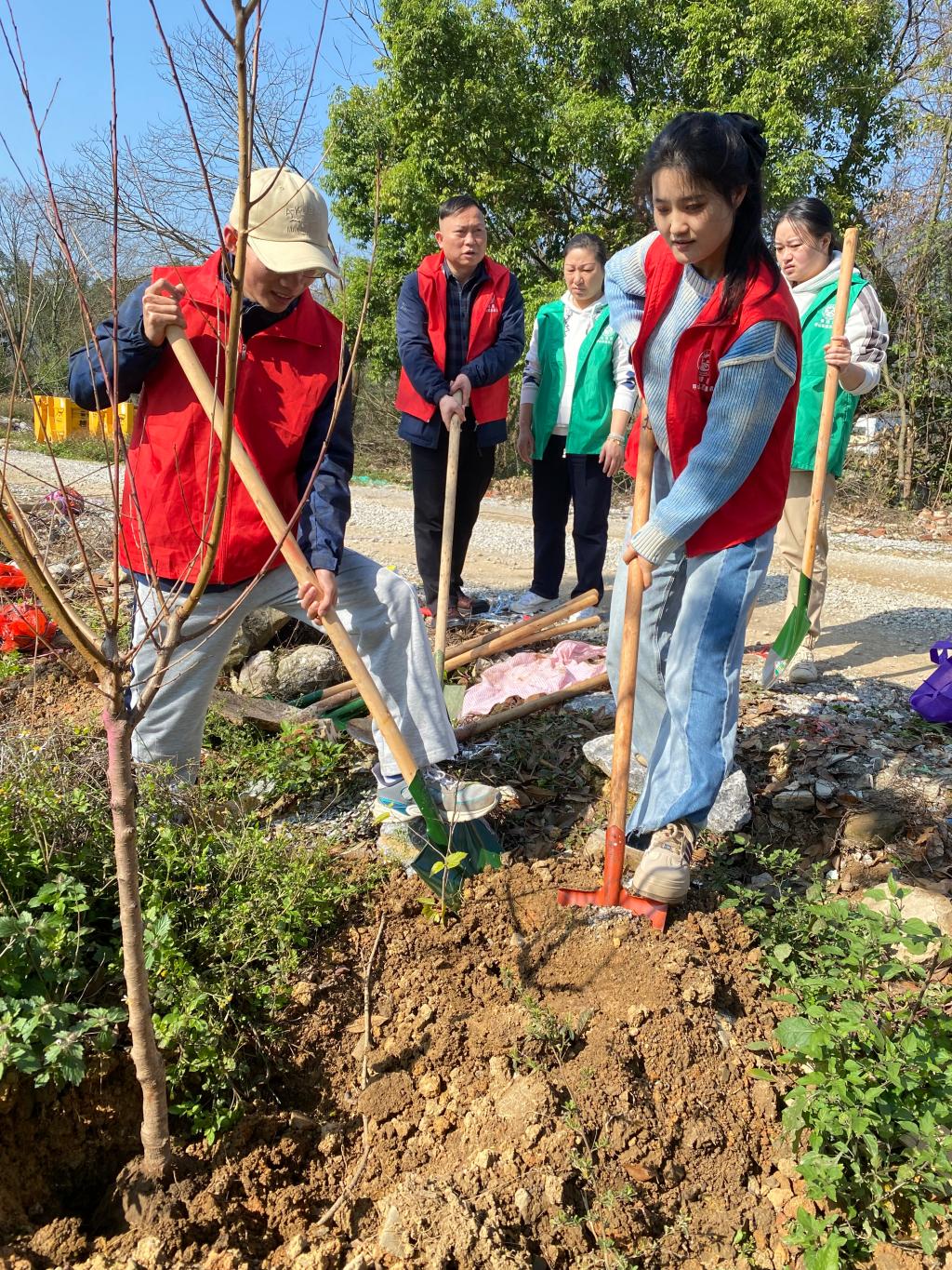 桃花江畔,理工学院学生党员在两位党支部书记王少鹏、黎金丽的带领下,个个热情高涨,分工协作,挥起铁锹、扶苗填土、打水灌溉。黎金丽指导学生们种树时坑要挖深,水要浇足,土要压实。现场植树经验丰富的学生党员也给大家耐心传授植树的方法与技巧。师生默契配合,各个环节有条不紊,充分发扬了团结、互助、友爱的精神。经过大家一番合作耕耘,一排排小树苗昂然挺立,为桃花江沿岸增添了一片绿意。2021级大数据专业黄醒同学感叹道:“虽然脚上沾满了泥土,但是这次义务植树活动让我们党员更好地践行了雷锋精神,激发了大家积极参与公益事业、服务社会的热情。”
