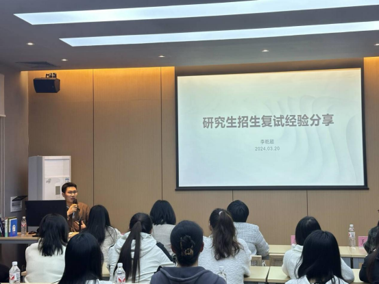 会上,李乾超上台分享了宝贵的复试经验和策略,介绍了复试流程、面试技巧以及如何准备相关材料等方面,为在场的学生提供了宝贵的第一手资料。接着,专业教师梁娟娟提到,考研复试是一次全面展示自己学术能力和个人素质的机会,希望同学们能够充分准备,展现出最好的自己。在互动环节中,学生们积极提问,与老师们深入交流,由吴东艳和王春莉两位教师分别为每一位上国家线的学生发放学院加油礼包,包含了复试资料、考试文具、心理调适指南以及学院的鼓励信。