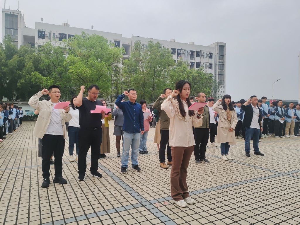 紧接着,与会教师在鲜艳的五星红旗下,庄严进行师德师风主题宣誓“忠诚人民教育事业,秉持‘向学、向善、自律、自强’校训精神......”,一句句誓言铿锵有力,既体现了教师们的责任与担当,也展现了他们为培养高素质人才而努力奋斗的决心。