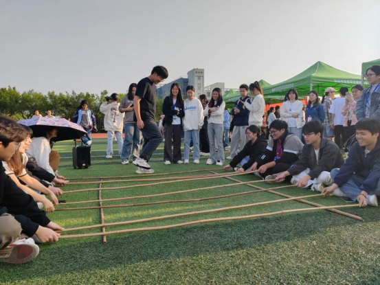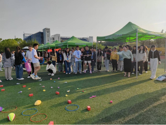 本次活动共有抛绣球、套圈、竹竿舞、踢毽子、三人板鞋及趣味知识竞答等十几个项目。其中,竹竿舞现场尤为热闹非凡,同学们在节奏明快的鼓点与竹竿敲击声中,勇敢尝试“过杆”舞蹈,亲身感受壮族独特的民族文化与风俗。每一次精准的跳跃、每一次默契的配合,都化作对民族艺术之美的生动诠释,现场洋溢着欢快热烈的节日气氛。
