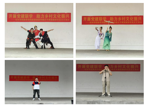 教育学院的老师和学生分别表演了精彩的文艺节目,有三人舞《牛背摇篮》、女声独唱《红提熟了》、双人舞《雨后》、男声独唱《把一切献给党》、陶笛独奏《赛马》和小组唱《不要怕》、双人舞《湘君夫人》、男声小组唱《中峰之恋》。在六一儿童节到来之际,中峰镇红军小学的小朋友们也前来参加了活动,他们表演了集体舞《长征路上的娃娃兵》和诗朗诵《中国话》。