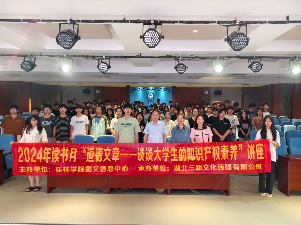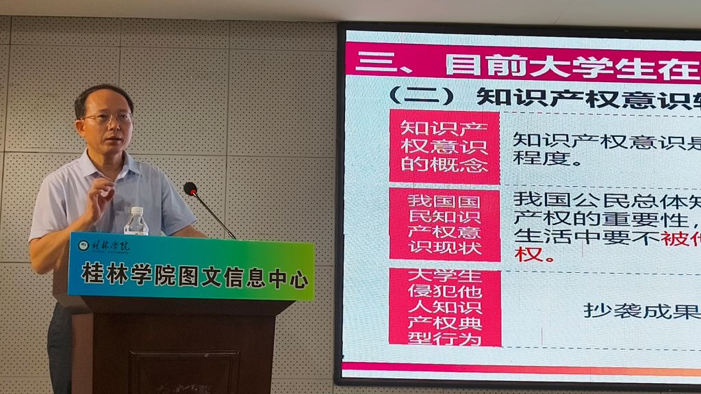 为了深化大学生对知识产权保护的了解,提升大学生的知识产权素养,弘扬法治文化。2024年6月13日下午,广西师范大学陈宗波教授在至善讲堂为我校学生作了题为《道德文章——谈谈大学生知识产权素养》的普法讲座,图文信息中心主任何秀梅老师以及我校来自各个学院的学生共180人聆听了此次讲座。