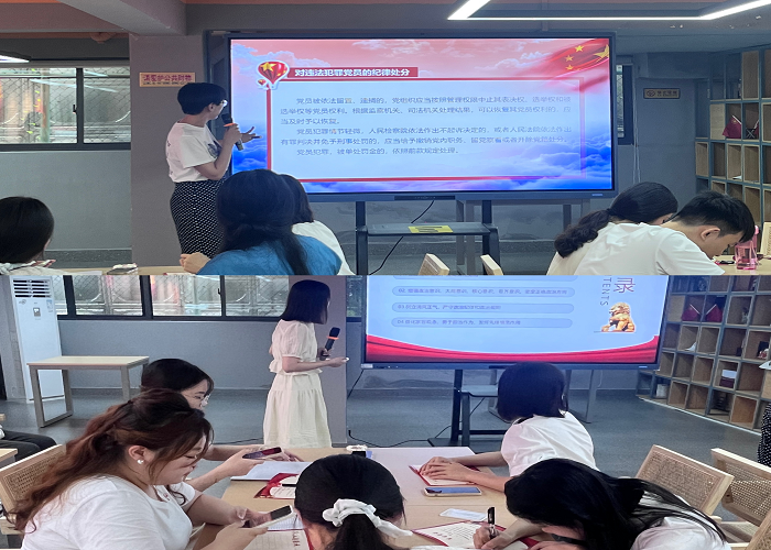 支部书记梁琪老师为全体毕业生党员开展“严守党纪党规,争做合格党员”主题党课。她通过焦裕禄不占公利和周总理的廉洁清正故事,以正向引导,教育党员们应该严于律己、清正廉洁。张梅洁老师带领支部成员学习《中国共产党纪律处分条例》中“第八章 对违反廉洁纪律行为的处分”等内容,更加深入地阐述党的纪律要求,引导支部成员更加自觉地遵守党的各项规定,以更加饱满的热情和更加坚定的信念,投身今后的工作岗位中。