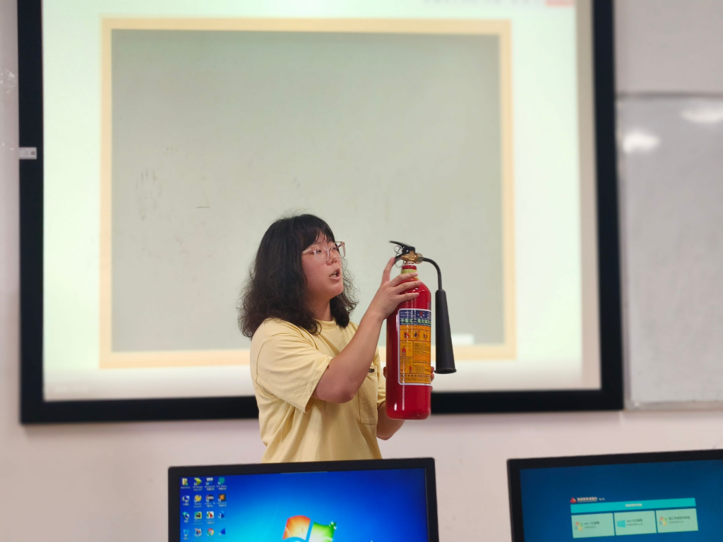 学院消防安全员杨云岚向老师们展示了灭火器的使用方法,讲解使用灭火器前后需要注意的相关事项。全体老师一起观看灭火器使用和逃生绳索的教学视频,并进行现场实操练习。