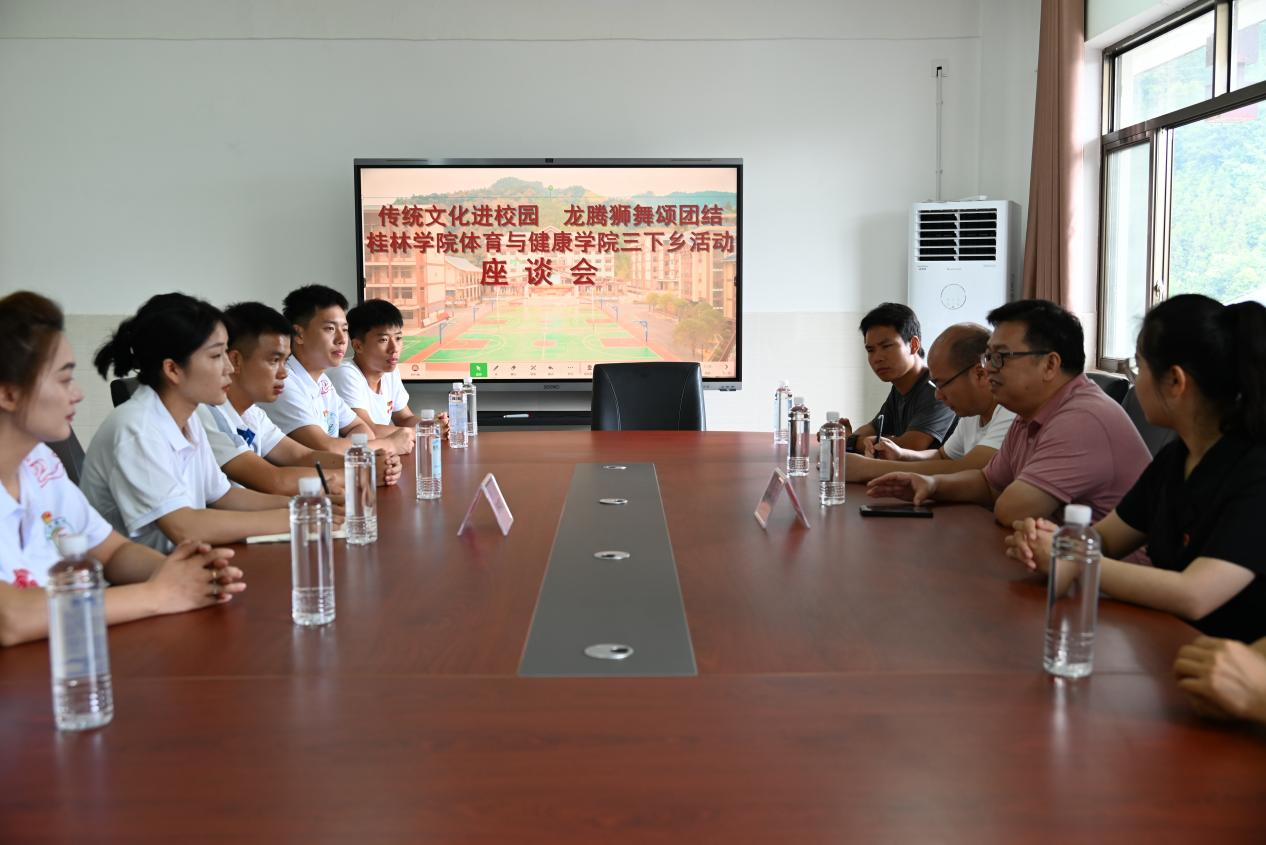 活动伊始,龙胜中学校长秦光红热情地接待了学院老师同学,并进行座谈交流。秦校长对桂林学院一行的到来表示热烈欢迎和衷心感谢,随后详细介绍了龙胜中学分校的办学特色、体育器材、场地设施建设及体育活动开展等情况。双方教师围绕如何更好地传承和弘扬传统文化、促进学生全面发展等议题进行了深入交流,共同探讨了未来的合作方向。