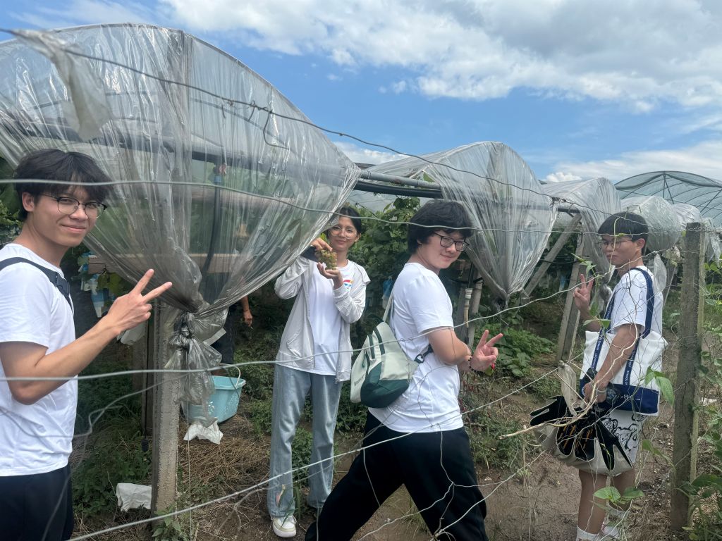 下午,“三乡共筑梦”团队前往大圩提香腾飞葡萄园,葡萄园的负责人熊师傅向成员介绍,葡萄的种类达到上万种,熊师傅所在的这片葡萄园以手工采摘和打包礼盒出售为主,农户集中土地,进行不同种类的葡萄种植,经过大圩古镇的引流,带来了颇丰的收益。随后,团队成员与葡萄园负责人走进葡萄棚中,体验采摘葡萄的乐趣。
