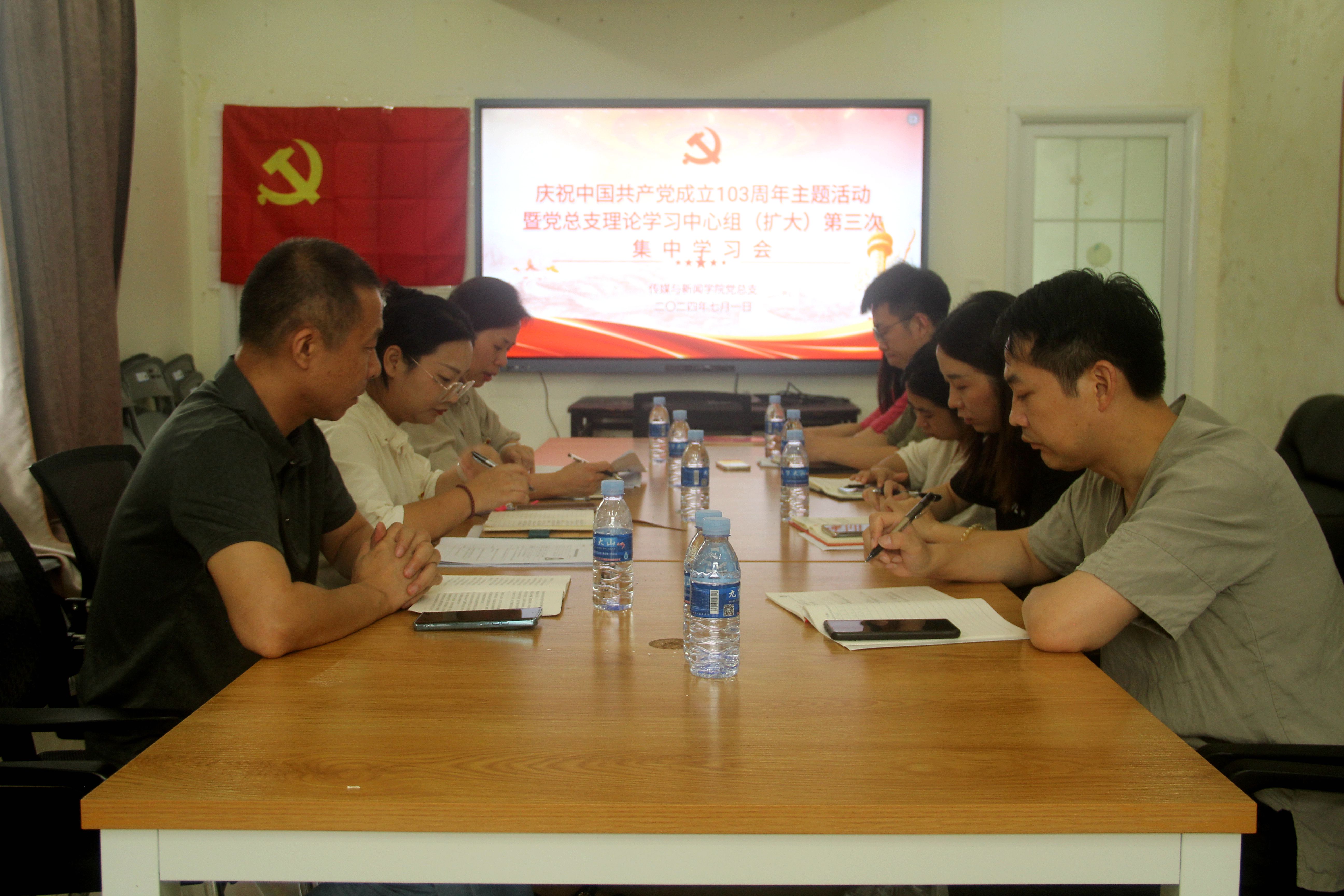 7月1日,传媒与新闻学院党总支在学院二楼会议室召开庆祝中国共产党成立103周年主题活动暨党总支理论学习中心组(扩大)第三次集中学习会。学院党总支书记翟彦、副书记李晓蕾、党总支委员出席会议,各党支部书记、团总支书记、党员教师代表列席会议。会议由翟彦书记主持。