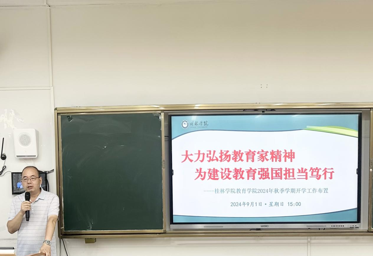 教育学院党总支书记代表领导班子,以“大力弘扬教育家精神,为建设教育强国担当笃行”为主题对学院秋季学期工作进行了动员和总体部署。书记先回顾了暑期开展的工作,包括就业工作、人才培养方案修订、教工支部样板党支部中期迎查工作等,通报了就业工作取得的成绩,对假期中积极参与工作的老师们表示了慰问与感谢;然后传达了学校在北部湾大学召开的暑期研讨会精神,介绍研讨会召开的情况,分享了学习和收获;接着根据学校的总体部署,对本学期学院总体工作做了安排,特别强调了重点工作、专项特色工作和近期工作。最后,书记希望全体教职工,认真学习党的二十届三中全会精神,在学校迎接本科教学合格评估的新形势下,挺直脊梁、咬紧牙关,“要保持过去革命战争时期的那么一股劲,那么一股革命热情,那么一种拼命精神”把工作做好。