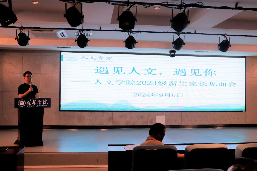 党总支书记对学院信息、专业发展和人才培育等作详细介绍。他强调,人文学院拥有良好的办学条件和优秀的师资队伍,在党建思政、教学科研、专业发展和平台建设等方面取得了诸多标志性成果。紧接着,他结合考研率、就业率、荣誉获奖等数据详细阐述了学院各个专业以及对外交流合作等方面的人才培养举措及成效。党总支书记最后以学习贯彻习近平总书记关于教育强国建设的重要讲话精神为目标,向全体新生家长提出6个“聚焦”号召,强化家校共育,共同推动学生健康成长。