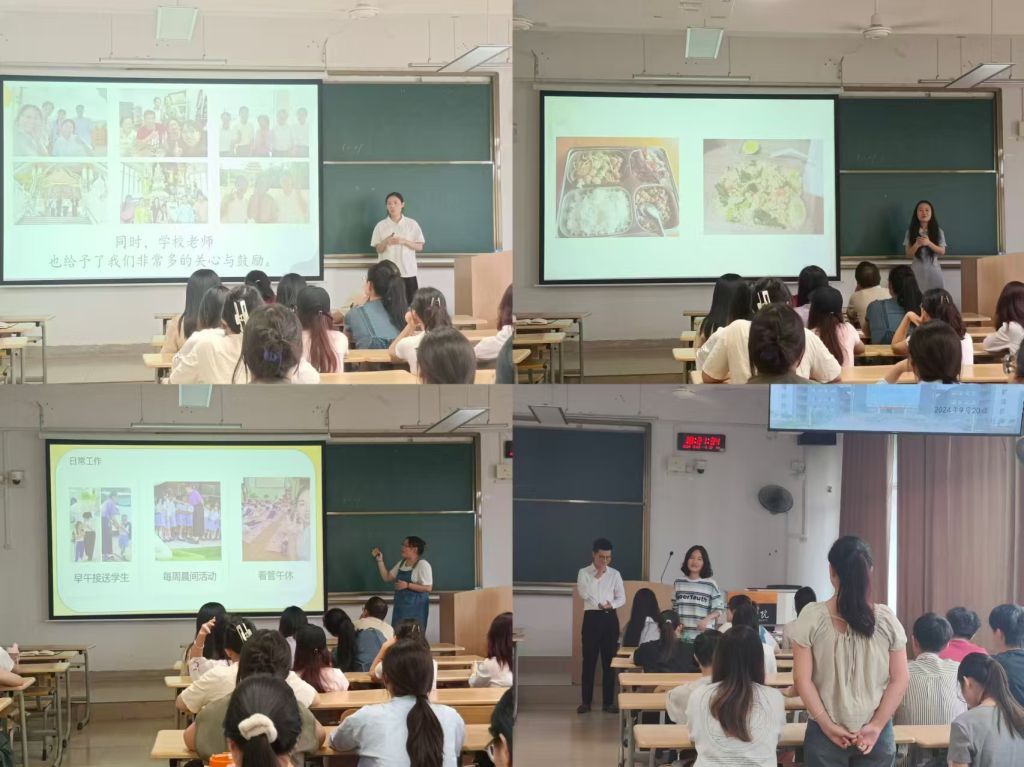 会议伊始,六个实习点的实习生代表从实习学校规模、生活住宿环境、实习工作内容等方面分享了各自的实习生活。通过分享,实习生不仅讲述了教学内容设计、课堂处理技巧、师生沟通方式等教学活动,还介绍了参与校园文化活动、中泰民俗活动等实践活动,分享了在泰国实习期间的生活趣事和喜乐情感。