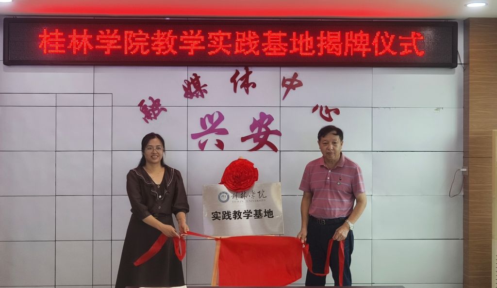 兴安县融媒体中心主任邓桂荣(左)与传媒与新闻学院院长(右)共同为实践教学基地揭牌