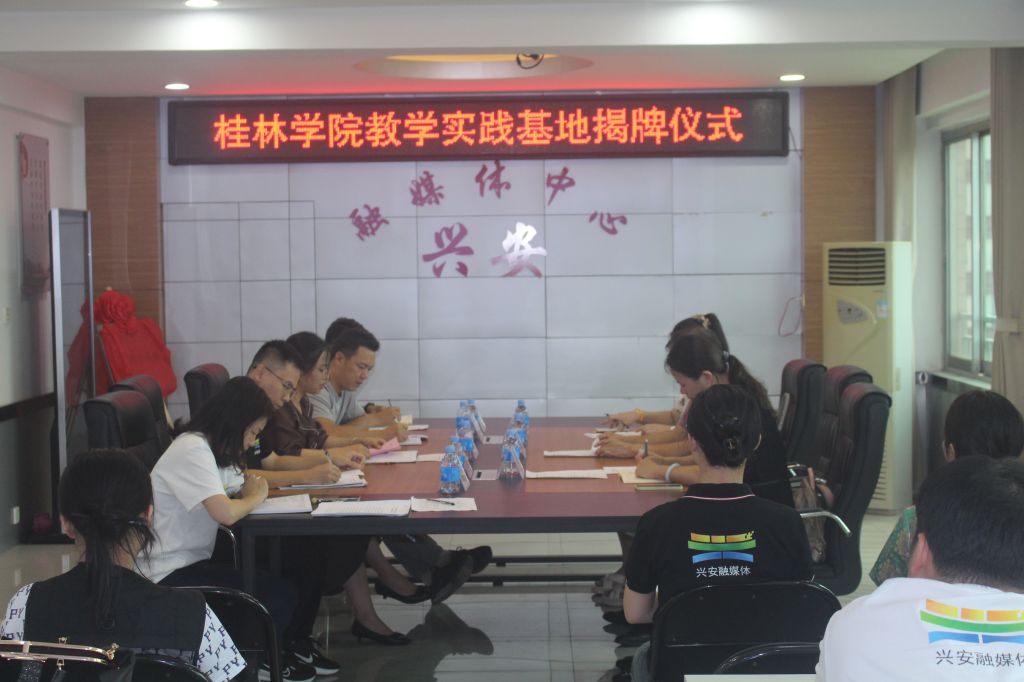 9月29日上午,传媒与新闻学院与兴安县融媒体中心实践教学基地揭牌仪式在兴安融媒体中心六楼会议室举行。兴安县融媒体中心主任兼兴安县委宣传部副部长邓桂荣、桂林学院传媒与新闻学院院长、党总支书记共同完成揭牌仪式。兴安融媒体中心副主任肖帆、黄振开及中心全体成员,传媒与新闻学院广播电视编导专业专任教师及实习学生参加揭牌仪式。